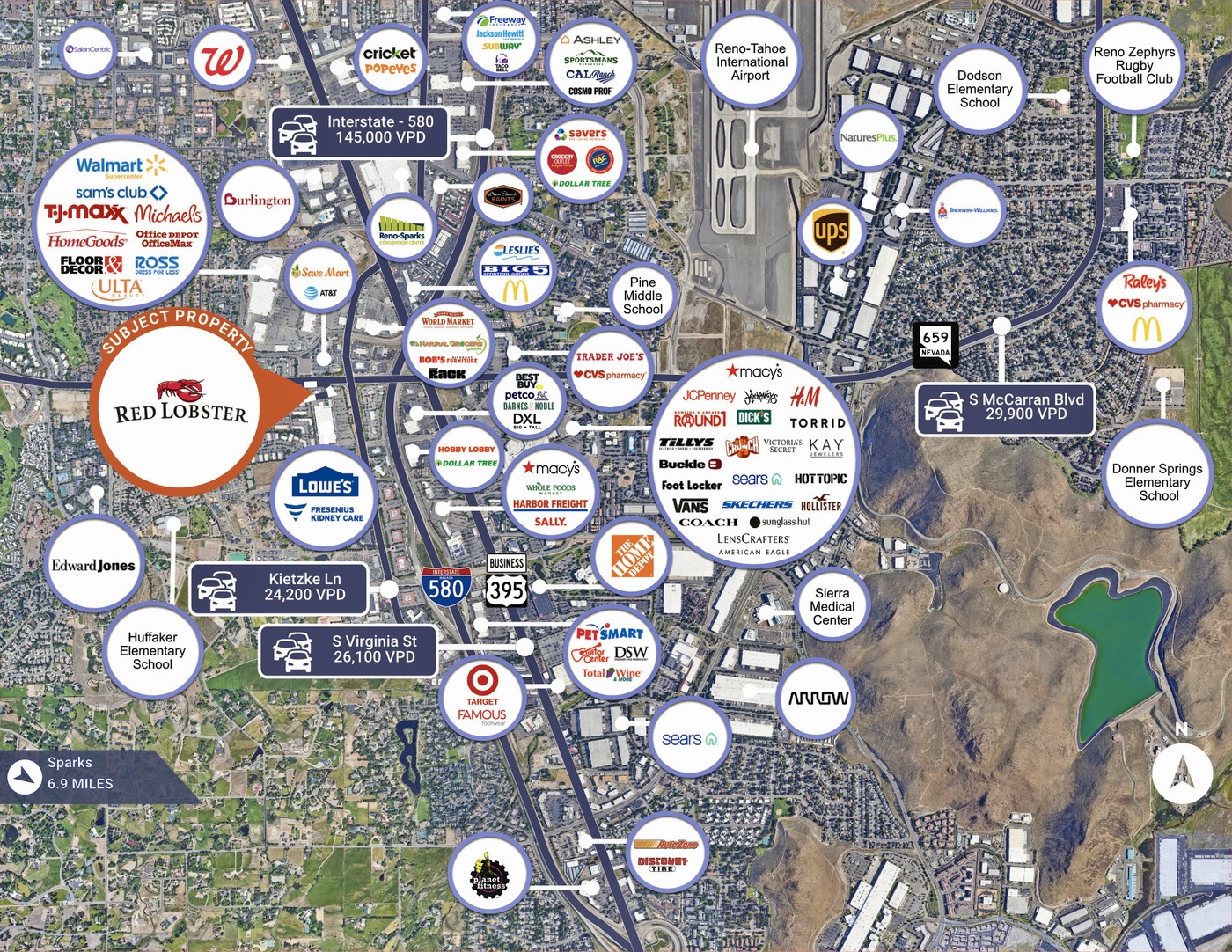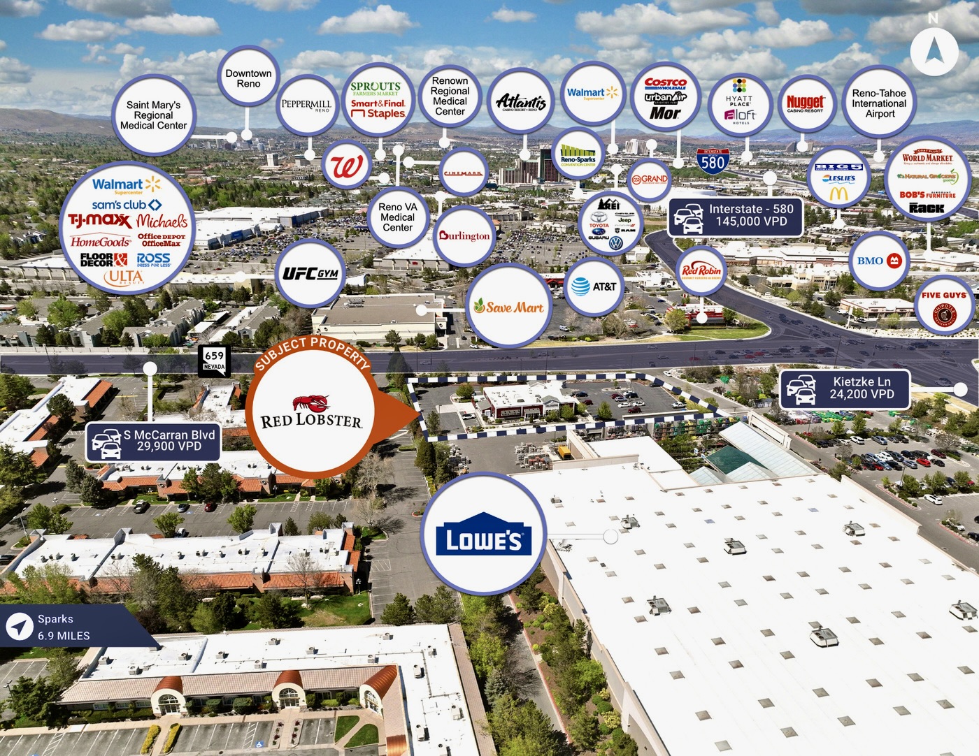 - Excellent location as a pad to a Lowe’s Home Improvement at the southwest corner of S. McCarran Blvd (39,100 VPD) and Kietzke Lane (25,700 VPD)